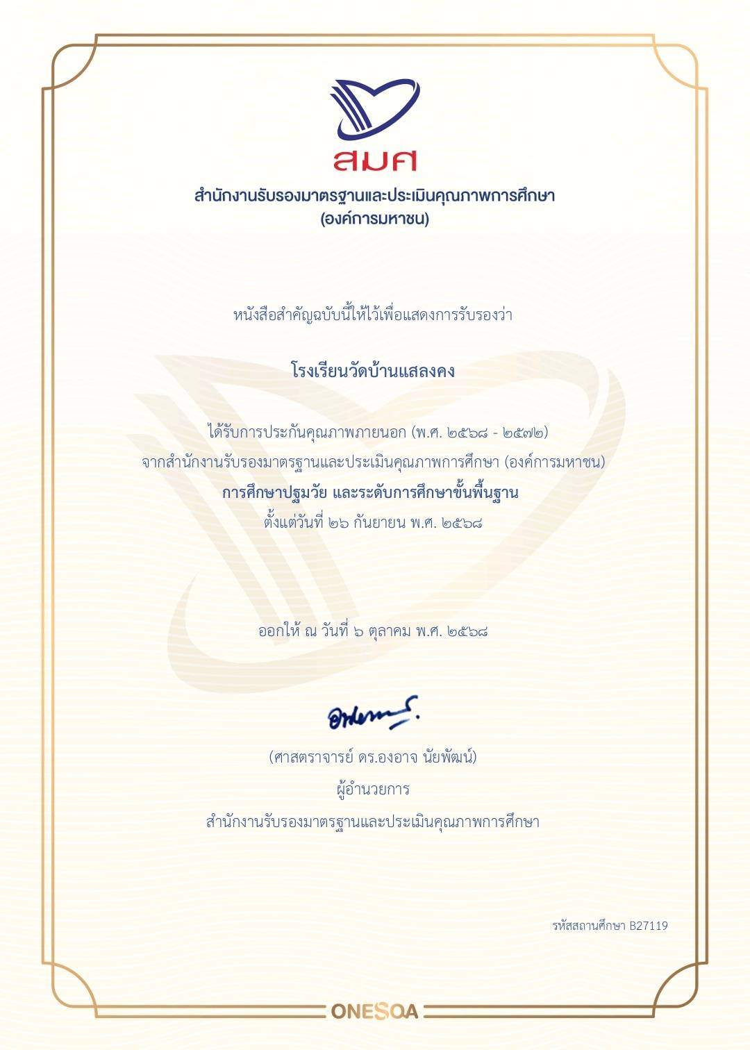 ผลการประกันคุณภาพภายนอก (พ.ศ.๒๕๖๘ – ๒๕๗๑) จากสำนักงานรับรองมาตรฐานและประเมินคุณภาพการศึกษา (องค์การมหาชน)ระดับการศึกษาปฐมวัย และระดับการศึกษาขั้นพื้นฐาน